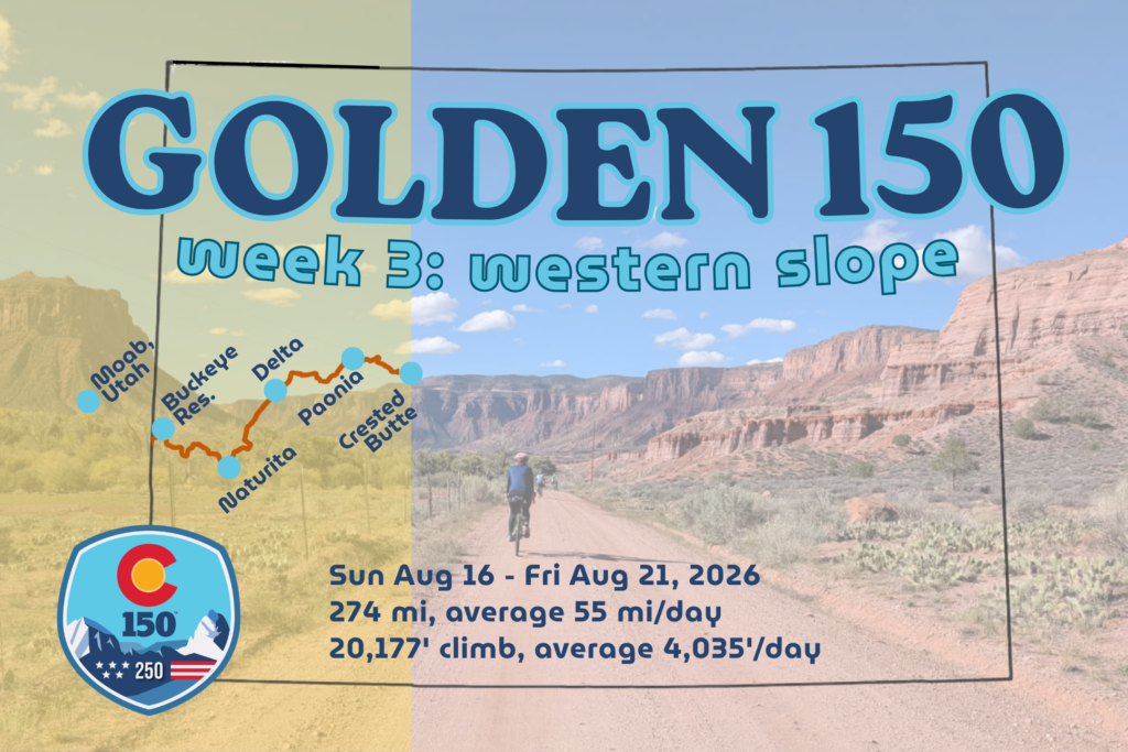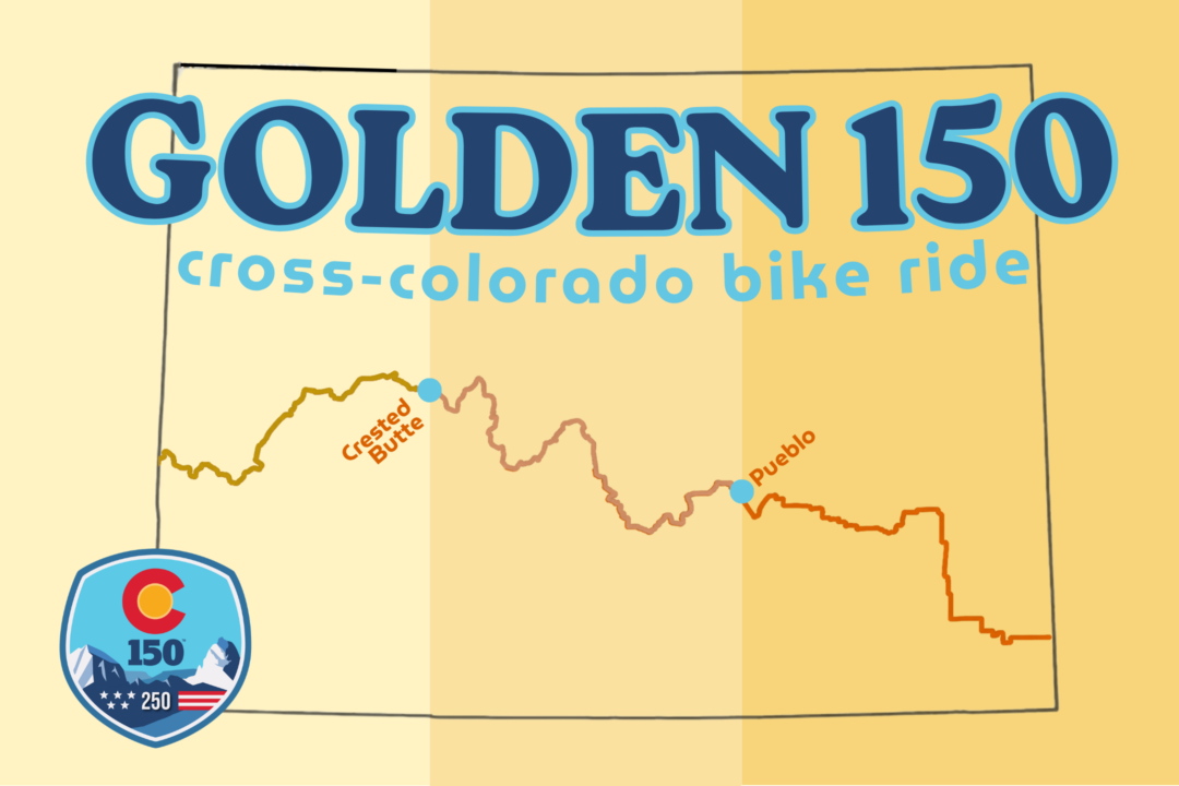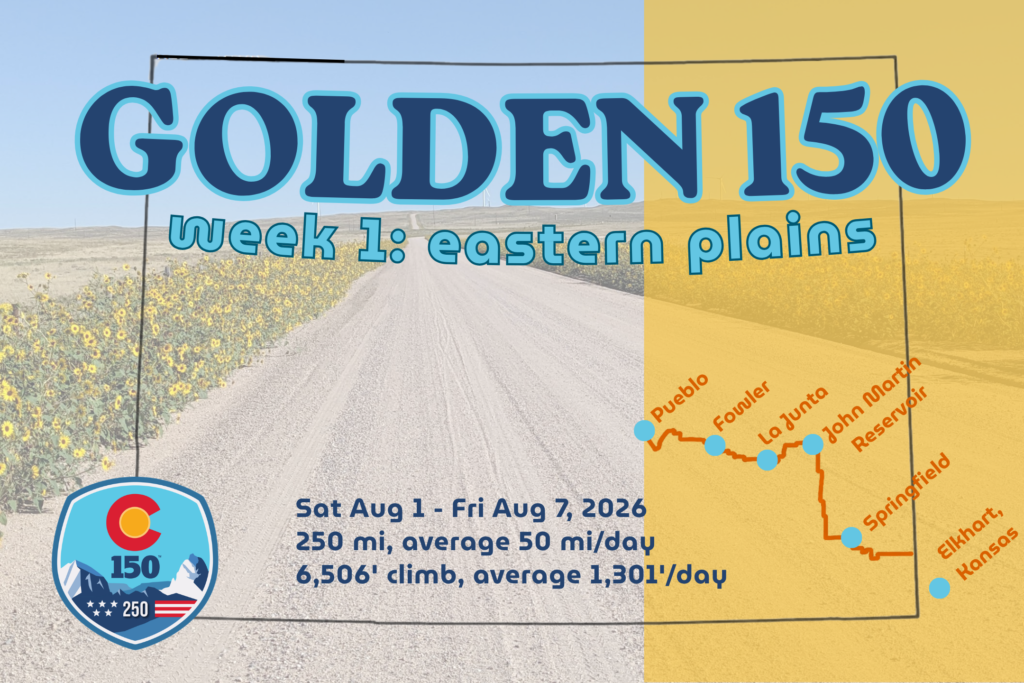 The Golden 150 is a three-week bike ride across Colorado from border to border, east to west, in honor of our Centennial State’s 150th birthday! The route follows the Colorado section (Section 3) of the Adventure Cycling Association’s newly-launched Golden Gravel Trail.